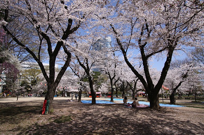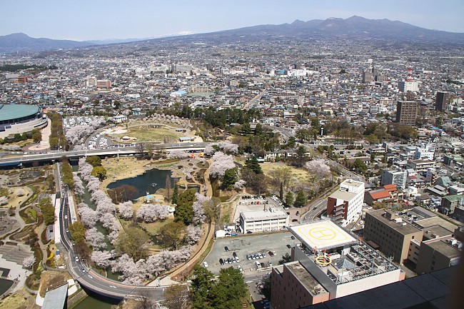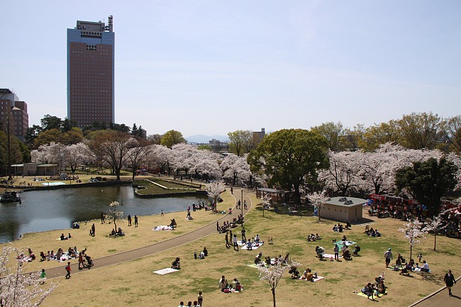 Maebashi Park is located just beside the Gunma Prefectural Office Building, where there is an observation deck on the 32nd story which provides great views of Maebashi City (admission free). Today I found the couple of hundred cherry trees at the park to be at full bloom, albeit having lost some petals to yesterday's rain. However, again, with a wet weekend lurking, I am not optimistic that the best views here will survive into Monday.