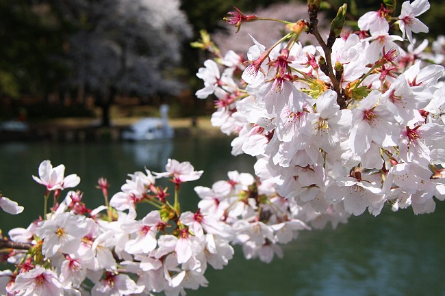 Today many were at the park having barbecues, riding leisure boats, and enjoying the cherry blossoms. I had a great time too watching the ducks swim by and photographing the nice flowers. The state of the blossoms here was similar to that of the previous locations.
