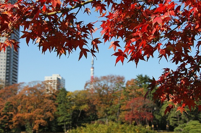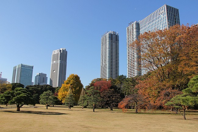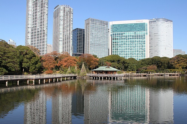 Reddish hues dotted the scene when I arrived at Hama Rikyu. A sense of tranquility was eminent, with the crowds lost to the buildings behind the garden. The buildings - part of the chic Shiodome district - provided the perfect juxtaposition that demonstrates the side of Tokyo that finds a balance between a sprawling metropolis and space for relaxation. Fall colors here should get better over the next few days, although I am not sure they will by much, because leaves on some trees were already drying up before changing colors. Perhaps the conditions weren't conducive at Hama Rikyu this year.